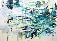 A commonality in the entire body of Saito's work, both on stage or on canvas, focuses on written signs. Repeated investigations of alphabet in Saito's work, both real and made-up, legible and obscured, speak to moments in his personal history.[4] As a young immigrant in a country whose language he did not speak, Saito wrote space for himself in the already-established Color Field tradition by constructing his own painterly lexicon. Opposing motifs of free gestural brushstrokes and elegant, ordered lettering allude again to his double practice as painter and architect of poetic performance. Abstraction in Saito's work points to a meditation on the instabilities and impermanence of language and the mutability of meaning. A space opens once departing from structuralist systems of transmuting signs, and Saito fills that space with vibrant color.