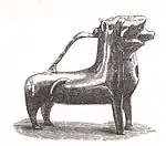 In 1868 a crannog, its causeway and up to four logboats were revealed at the south-west corner of the loch as a result of dumping of furnace-slag from the now closed ironworks,[6] causing the lake-bed sediments to be pushed upwards so that the crannog and logboat remains were exposed above the surface of the water. A site known as 'The Cairn' was already recognised, being exposed during exceptionally low water conditions.[20] The crannog and causeway are marked on the 1st edition of the OS 6-inch map (Ayrshire, sheet viii) at NS 3238 5356. Two of the boats were recorded in some detail. The most complete of the logboats was 18' (5.5m) in length, 3' (0.9m) in breadth and circa 2' (0.6m) in 'depth'; about 2' (0.6m) had been lost from the bow. The stern was 'square'. A tripod pit and a bronze ewer were found in one of the boats, now preserved at the Royal Museum of Scotland. These items were not contemporary with the logboat.[21] The boat itself disintegrated rapidly on exposure to air. Part of a second logboat was subsequently found 'close by the island'; its fate is not recorded. This boat was worked from 'oak'.[22]