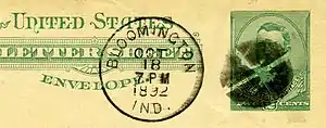 In the United States this is also the name for a particular circular date stamp with four thick horizontal bars to the right. This handstamp effectively cancels the stamp while leaving the place and date information easily visible. The bars are known as killer bars.[2]