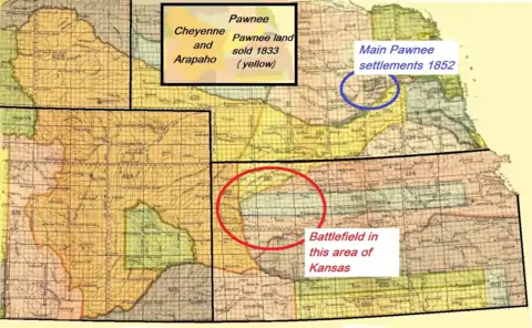 The Pawnee were in camp somewhere in what is now western Kansas on their summer bison hunt.[3]: 200 A combined force of Cheyennes and invited Kiowa and Kiowa Apaches attacked a large contingent of Pawnee hunters to achieve war honors and capture horses.[1]: 92 Some Arapaho and Lakota friends of the Cheyenne may have joined.[2]: 294
