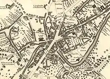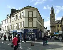 Kilmarnock Cross is a public square in Kilmarnock, East Ayrshire, Scotland. In Rambles Around Kilmarnock (1875) Archibald R Adamson described it as "most spacious, although of a most peculiar form, having no less than seven streets branching off it. In the centre stands a marble statue of Sir James Shaw, who rose from a humble position to that of Lord Mayor of London".[1]
