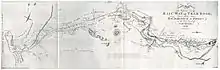 The choice of the older technology may be due to the employment of William Jessop as engineer. He had built the Surrey Iron Railway, also a plateway. The wrought iron rails were L-shaped, and the upstand guided the wagons; the wagon wheels did not have flanges, which enabled them to be easily moved around terminal areas where there was hard standing, and to and from locations further from the railway. The plates were three feet long, with a four-inch width and a three-inch upstand (920 mm long by 100 mm by 76 mm). Highet says, "These plates or rails were joined with a square joint and were nailed to the foundation stones through small square holes formed half-way in each end of the rail."[4] Clearly the plates were carried on sleeper blocks; the "nails" refers to pins fastened into timber plugs in holes drilled in the stone blocks. The gauge of the line (i.e. the dimension over the upstands) was 4 ft (1,219 mm). The route was nine miles six furlongs (15.7 km) in length.[4]