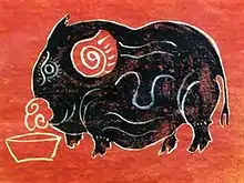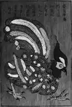 Produced in the countryside as Dong Ho painting, pictures of Kim Hoang share many common themes with ones of Dong Ho such as everyday activities, animals and sprititual signs. The distinct feature of Kim Hoang painting is several lines of poem written in form of chữ thảo at the left corner of the painting, the content of those lines along with the illustration help emphasize the meaning of the picture. The popular examples of Kim Hoang painting are Gà độc (Cockerel) and Lợn độc (Pig).[1][2]