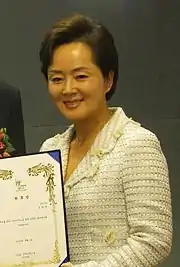 In 2009, she drew praise for her portrayal of a terminally ill yet headstrong mother who has a love-hate relationship with her daughter in the dramedy film Aeja (internationally known as Goodbye Mom).[1][5][6][7][8] Another notable role was as a Busan restaurant owner whose son is arrested and tortured during the 1980s in The Attorney (2013). Kim later won Best Supporting Actress at the Grand Bell Awards and the Blue Dragon Film Awards for her performances.[9][10]