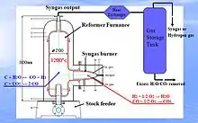The reformer reforms all carbon atoms of carbonaceous feedstock to produce just syngas, no other hydrocarbons. The high temperature furnace is packed with castables to minimize heat loss in such a way as to maintain the inner temperature of a reduction reactor filled with steam and carbon dioxide (CO2) gas at a temperature just above 1200 °C (aka Kim temperature, see figure 2),[1] and it reforms all carbonaceous substances most efficiently to produce syngas. The produced syngas exits from the reduction reactor at a temperature of 1200 °C. The reduction chamber is heated by super-hot gases (steam and CO2) generated in the syngas burner with oxygen gas. The reduction chamber must be constructed to withstand, physically and chemically, the reforming reaction at 1200 °C.