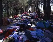 In Kimsooja's first video performance, Sewing into Walking-Kyungju (1994), Kimsooja is seen atop the valleys of Gwangju (formerly spelled Kwangju), South Korea, picking up scattered bedcovers on the valley's floor and wrapping them into a bundle. A year later, Kimsooja returned to the valley for the first Gwangju Biennale in Korea and scattered various clothes made of traditional Korean fabrics on the ground of a forest. This installation, made of 2.5 tons of second-hand clothes and entitled Sewing into Walking- Dedicated to the victims of Kwangju, commemorated the victims of the suppression of a democratic protest in Gwangju in 1980. This work established an analogy between the structure of fabric and that of the land, which was of particular importance in terms of confirming the three-dimensionality and spatial topology of fabric in Kimsooja's work, as well as establishing her body in performance as a needle that weaves through the fabric of humanity and nature.[14]