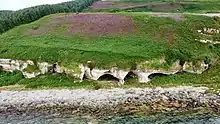 King's Cave (Scottish Gaelic: Uamh an Rìgh) is the largest of a series of seafront caves north of Blackwaterfoot on the Isle of Arran in Scotland.[1] The caves were formed when melting glaciers resulted in a raised beach due to a process called isostatic rebound.[2] Kilmory Parish church records suggest the cave may have been used for church meetings in the eighteenth century,[3] and it is also said to have been used as a school.[3] Before being known as the King's Cave it was known as Fingal's Cave after Fionn mac Cumhaill.[4]