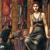 King Cophetua and the Beggar Maid is an 1884 painting by the Pre-Raphaelite artist Edward Burne-Jones. The painting illustrates the story of 'The King and the Beggar-maid", which tells the legend of the prince Cophetua who fell in love at first sight with the beggar Penelophon. The tale was familiar to Burne-Jones through an Elizabethan ballad published in Bishop Thomas Percy's 1765 Reliques of Ancient English Poetry and the sixteen-line poem The Beggar Maid by Alfred, Lord Tennyson.[1][2]