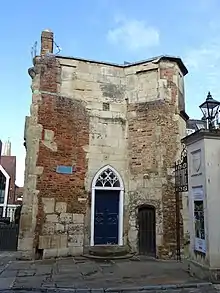 The remains of the gatehouse consist of a single two-storey ashlar west side wall. This was extensively repaired and in-filled with red brick in the early 19th century. On the face of the south end is a jamb of a former arched carriageway. There is a stair turret at the north end, which is faced in ashlar, and has two-light windows on the first and top floors. The entrance doorway in the centre of the wall was added in the 18th century which serves as an entrance to the house behind the wall, it has a pointed arch containing fanlight inset with wrought-iron and Gothic tracery. The north front shows evidence of a former in-filled doorway with three stone steps to the threshold, which is now a little above street level. The interior of the house consists of early 19th century features including a stair case with stick balusters and a fireplace with reeded architrave surround.[1]