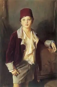 Fuad, who did not speak Arabic, insisted that the crown prince learn Arabic so he could talk to his subjects.[17] Farouk became fluent in classical Arabic, the language of the Koran, and he always gave his speeches in classical Arabic.[20] As a child Farouk showed a facility for languages, learning Arabic, English, French and Italian, which were the only subjects he excelled in.[17] The more honest of Farouk's tutors often wrote comments on his childhood essays such as "Improve your bad handwriting and pay attention to the cleanliness of your notebook" and "It is regrettable that you not know the history of your ancestors".[17] The more sycophantic of his tutors wrote comments like "Excellent. A brilliant future awaits you in the world of literature" on an essay that began with the sentence "My father had a lot of ministers and I have a cat".[17] Farouk was known for his love of practical jokes, a trait that continued as an adult, for instance he liked to free the quail that the game keepers had captured on the grounds of the Montaza Palace and he once used an air gun to shoot out the windows at the Koubbeh Palace.[21] When Queen Marie of Romania visited the Koubbeh Palace to see Queen Nazli, Farouk asked her if she wanted to see his two horses; when she answered in the positive, Farouk had the horses brought into the royal harem, which greatly displeased the two queens as the animals defecated all over the floor.[22] Farouk's Swedish au pair, Gerda Sjöberg, wrote in her diary: "The truth doesn't exist in Egypt. Breaking promises is normal. Farouk is already perfect at this. He loves to lie. But it's amazing Farouk is as good as he, given his mother.” [11] Knowing of his family's genetic predisposition to obesity, King Fuad kept Farouk on a strict diet, warning him that the male descendants of Mohammad Ali the Great tended to get obese very easily.[17]