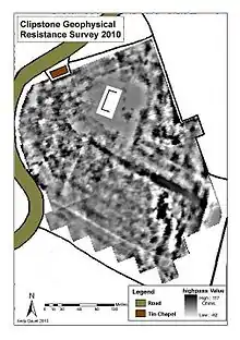The 2004 geophysical survey of the site identified the hidden foundations of walls, "robber trenches" where older walls had been dug up in the past for their valuable stone, and ditches. A possible rectangular enclosure around the lodge was also discovered.[40]