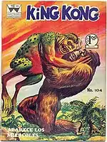 Outside of these major comic book companies, King Kong was featured in various smaller publications as well. In 1933, an adaptation of the original film was published in Spain in the magazine Bowling by Josep Alloza. That same year an adaptation appeared in issues #320-#336 of Rin-tin-tin by Marco Publishing by Casals and Arlet.[63] King Kong was also featured in a Japanese comic in 1947 that was illustrated by Osamu Tezuka and published under the "Red Book" banner by Fuji Shobo.[64] In 1951, in the free comic The Adventures of the FBI #57 (Rollán Publishing), an adaptation of The Son of Kong, called The Son of King Kong, was done by M. Gonzalez and L. Bermejo.[65] He also appeared in short promotional comic strips promoting the King Kong banana- and toffee-flavored ice pops manufactured by Wall's in England in 1977/78[66] .[67] He was featured in a spoof story in issue #106 of Mad House from Archie Comics in 1977.[68] He was featured in issue #41 of the Elvifrance comic series Green Series (Serie Verte) in an issue titled The Secret of King Kong.[69] He was also featured in issue #6 of the Italian comic series Erotic Comic Selections,[70] and appeared in issue #215[71] and #607[72] of the New Tintin (Nouveau Tintin) comic in 1979 and 1987 respectively. A comic strip adaptation of the original film appeared in issue #887 of the French magazine Pif gadget in 1986.[73] In Japan, a pair of Manga adaptations of the 1976 remake were published. The first in the October and November 1976 issues of the boys magazine Monthly Shonen Magazine,[74] while the second was published in the December 1976 issue of Separate Volume TV Land by Daiji Ippune.[75] In 1996, both the 1933 film and King Kong vs Godzilla were briefly featured in the hardcover manga about Eiji Tsuburaya's life called Eiji Tsuburaya: The Film Director Who Made Ultraman (円谷英二 : ウルトラマンをつくった映画監督). This book was published by Shogakukan. Avatar Press featured King Kong as a metaphor for Willis O'Brien in Cinema Purgatorio #4.[76] In 1948 (from February to July), Edmond-François Calvo illustrated a King Kong comic strip in France that ran 13 issues. However, this King Kong was just a regular-sized gorilla.[77][78] In 1954, King Kong makes a brief cameo in the story "The Monster Maker" from Baffling Mysteries #15.[79] Outside of these cameos and one-shot appearances, King Kong has been spoofed and has influenced other giant apes in comics for many years.[80]