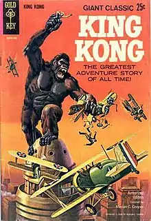 Gold Key Comics, a subsidiary of Western Publishing, put out an adaptation in 1968, drawn by Alberto Giolitti with a cover painting by George Wilson (other credits are unknown),[22] while Golden Press also released the comic (with the Whitman logo) as part of a Treasury Edition release.[23] This oversized comic was commissioned by Merian C. Cooper and was based on the 1932 novelization by Delos W. Lovelace, (of which Cooper owned the copyright) rather than the 1933 film. It was reprinted a few times upon the release of the 1976 remake, not just in the U.S (by Golden Press),[24] but other countries as well, translated into Dutch,[25] Swedish,[26] German[27] and Norwegian editions.[28]