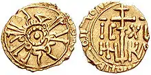 At Mahdia, Roger I and William I minted dinars of pure gold, 22 mm in diameter and weighing 4.15 g with Cufic inscriptions, probably for internal circulation in Africa.[33] The only two known coins were first discovered by the Tunisian scholar H. H. Abdul-Wahab in 1930. They were a close imitation of a type minted by the Fatimid caliph al-Zahir (1020–35) over a century earlier.[34][33] In Fatimid fashion, the coins have inscriptions in two concentric circles with two lines of text in the centre. The circular text is the same on both sides, while the central text differs. In Roger's coin, it reads "Struck by order of the sublime king (al-malik al-muʿaẓẓam) Roger, the powerful through God [Allah], in the city of Mahdia, in the year 543 [of the Hegira]", that is, 1148/49, in the outer circle and "Praise be to God, it is fitting to praise him and, indeed, He is deserving and worthy [of praise]" in the inner circle. The obverse centre reads "The King Roger", while the reverse centre contains his laqab "The powerful through God" (al-muʿtazz bi-ʾllāh).[33][35] William's coin is similar, but is dated to is dated to 549 (1154/5) and replaces Roger's Arabic laqab with his own, al-Hādī bi-Amr Allāh ("the Guide according to the command of God").[35] It has been observed that the inscriptions bear a resemblance to those of Robert Guiscard's tarì struck at Palermo in 1072. In both cases the mint would have been staffed entirely by Muslims.[33]