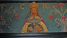 The bottom side of Agincourt Square is dominated by the fine 17th century coaching inn, and its attendant buildings provide an attractive range along Agincourt Street, though decorative facades of the former Monmouth Bank (c 1740) on the left, and the County Club (c 1877) with its fine oriel window on the right are much later buildings. The County Club (by T H Wyatt) has an attractive oriel window. The King's Head runs through to St John's Street, where it had its stabling, and since this spans the outer bailey ditch of the castle it drops a storey from front to back. It became an important posting inn under landlord Richard Ballard, who was Mayor of Monmouth in 1675 and also postmaster.[2] An ardent Royalist, he claimed the visit by Charles I, and issued brass tokens bearing the head of Charles II with the inscription "God Preserve our Gracious King". Charles I was reputed to have visited it in 1645, during a stay at Raglan Castle, and the Royalist landlord subsequently erected a plaster bas-relief of Charles in 1673, still to be seen above the fireplace in the left-hand Bar.
