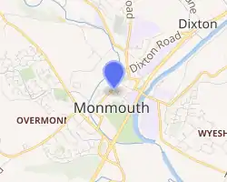 The King's Head Hotel is a hotel standing opposite the Shire Hall in Glyndŵr Street, Agincourt Square, Monmouth, Wales. It dates from the mid-17th century, and as one of the major inns in Monmouth was reputedly visited by Charles I of England in 1645. It has a fine black-and-white painted stone façade and became an important posting inn in the late 17th century, with a yard through an archway where visitors' horses could be stabled and where regular coach services called. In the 18th and 19th centuries, stagecoaches for London left from the inn. The range of buildings along Agincourt Street now includes the former Monmouth Bank and the County Club, while the inn itself is now part of the J D Wetherspoon pub chain. It is one of 24 buildings on the town's Heritage Trail and is a Grade II* listed building.[1]