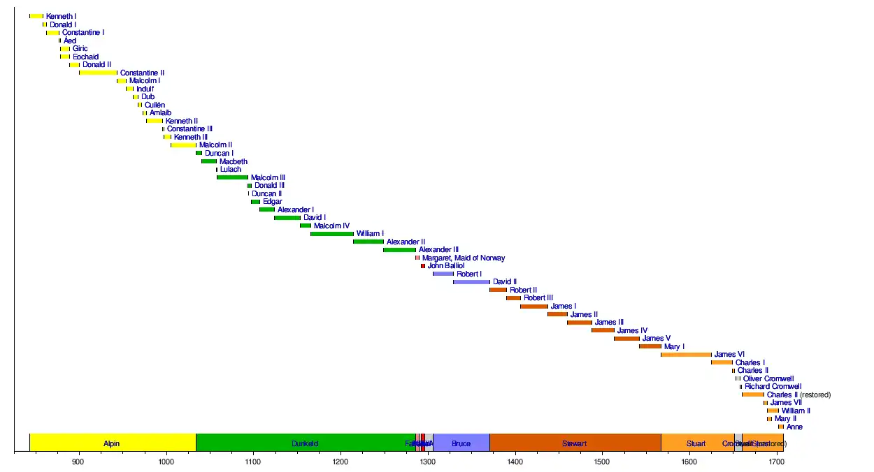 Anne, Queen of Great BritainMary II of EnglandWilliam III of EnglandJames II of EnglandCharles II of EnglandRichard CromwellOliver CromwellCharles II of EnglandCharles I of EnglandJames VI and IMary, Queen of ScotsJames V of ScotlandJames IV of ScotlandJames III of ScotlandJames II of ScotlandJames I of ScotlandRobert III of ScotlandRobert II of ScotlandDavid II of ScotlandRobert I of ScotlandJohn BalliolMargaret, Maid of NorwayAlexander III of ScotlandAlexander II of ScotlandWilliam I of ScotlandMalcolm IV of ScotlandDavid I of ScotlandAlexander I of ScotlandEdgar of ScotlandDuncan II of ScotlandDonald III of ScotlandMalcolm III of ScotlandLulach of ScotlandMacbeth of ScotlandDuncan I of ScotlandMalcolm II of ScotlandKenneth III of ScotlandConstantine III of ScotlandKenneth II of ScotlandAmlaíb of ScotlandCuilén of ScotlandDub of ScotlandIndulf of ScotlandMalcolm I of ScotlandConstantine II of ScotlandDonald II of ScotlandEochaid of ScotlandGiric of ScotlandÁed of ScotlandConstantine I of ScotlandDonald I of ScotlandKenneth I of ScotlandHouse of StuartOliver CromwellHouse of StuartHouse of StewartHouse of BruceGuardian of ScotlandJohn de BalliolGuardian of ScotlandHouse of FairhairHouse of DunkeldHouse of Alpin