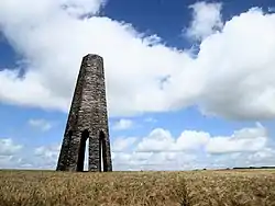 The daymark was constructed of local limestone and slate in an arable field. It is octagonal and sharply battered with a truncated open top, and has a tall narrow pointed head arch on each side, forming eight stilted pillars.[1]