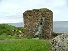 The wine tower is a small three-storey tower located approximately 50 metres (160 ft) from Kinnaird Head Lighthouse. The tower has been dated to the 16th century, and may have gained its name through use as a store associated with the castle.[9] The tower is accessed via the second floor, and contains elaborate carved stone pendants,[4] reputedly the result of its use as a covert chapel for the Catholic wife of Protestant Alexander Fraser.[3] It is reputed that in the cave below, one of the Fraser family imprisoned his daughter's boyfriend, leaving him to drown there. The daughter then jumped from the roof of the tower. There is red paint on the rocks below to illustrate her blood. According to local tradition, the tower is said to be haunted.[10]