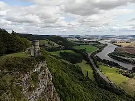 On an outcrop a few hundred yards to the east of, and several feet below, the summit is Kinnoull Tower, a folly built in the eighteenth century, by Thomas Hay, 9th Earl of Kinnoull, to resemble castles along the Rhine he had admired in Germany during his Grand Tour of Europe. Kinnoull saw a similarity between the mountainous landscape along the Rhine and the rocky outcrops on his estate near Perth. On his return, to achieve a similar effect, he built a modest castle on the highest point of Kinnoull Hill, with its tower overlooking the River Tay. The tower is a Category B listed structure.[3]