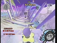 Kirby Air Ride (known as Kirby Bowl 64 or Kirby Ball 64 at the time; Kirby Bowl is the Japanese name for Kirby's Dream Course) began development during the early days of the Nintendo 64 video game console.[8] Much of the development was spearheaded by Masahiro Sakurai, the creator of Kirby. It was one of only two playable demos shown at the Nintendo 64's unveiling at the 1995 Shoshinkai show (the other being Super Mario 64).[9] At this point the game consisted of two sub-games.[10] One was somewhat similar to Marble Madness, as players would control a ball-shaped Kirby to either race across an obstacle course (in single player) or knock competing players off the playing field (in multiplayer).[11] The prototype received a mixed reception due to slow speeds and poor graphics. The other more closely resembled the final game: a snowboarding race in which Kirby collects stars for points.[10] It went through many changes during its elongated development period (the version shown at the 1996 E3 resembled a skateboarding sim[12]) before eventually being canceled. It then resurfaced on the GameCube in the form of a short video preview in March 2003 at the annual DICE summit in Las Vegas, at which point it received its final title. This preview received a mainly negative reception due to slow speeds and poor graphics, factors which the Kirby Bowl 64 prototype had also been criticized for.[13]