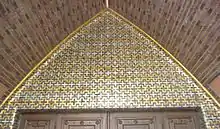 The painter and art professor Hermann Sandkuhl (in German) created decorative sgraffiti displaying various figures, situated in the intermediate recessed spaces between the brick pilasters on the building's exterior. All were destroyed in the fire in 1943.[8] The tympanon decoration by Erich Waske (in German) adorning the final, somewhat smaller, girder above the oriented quire, depicting the Sermon on the Mount and showing Jesus of Nazareth with a corona of light, was also lost in 1943.[8] The prayer hall is illuminated by three long windows in the quire. The original windows were completely shattered during the bombing of the city. In 1962, Sigmund Hahn designed a new central quire window and during the course of the renovation of 1990/1991 Achim Freyer (in German) added colorful new windows to the left and right of the quire.[9] Höger's original Baptismal font of clinker brick, adorned with gold paintings, survived the war intact. Regina Roskoden's abstract basalt sculpture of an angel, graphics by Max Pechstein and a painting of the crucifixion by Hermann Krauth are displayed in a by-room. Considerable offertories from parishioners enabled the purchase of a new organ of 60 registers, built by E. Kemper & Sohn and installed after 1965, which required the removal of the second western loft gallery of seats.[8]