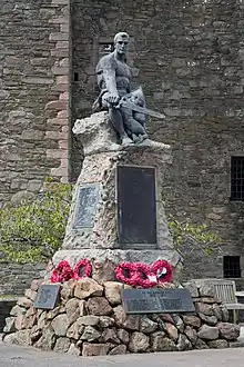Kirkcudbright war memorial commemorates the men of the Scottish town of Kirkcudbright killed during the First and Second World Wars. It is situated in front of the 16th-century MacLellan's Castle and shows a seated warrior with sword and shield with a sleeping child on his knee. The memorial was designed by George Henry Paulin and erected in 1921 to commemorate the men lost during the First World War. Additional plaques were added following the Second World War.