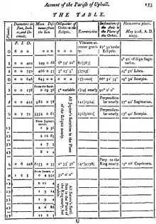 The table giving the dimensions of his representation is carved into the east face of the stone pillar, or belfry; it is barely legible now, but the details are preserved in the Uphall account.[14] Planet diameters and distances on the pillar are reproduced here, along with the values obtained by scaling inches up to miles, by a factor of 12,283.28. Modern values are shown for comparison. Details for the moons of Jupiter and Saturn have been omitted.[lower-alpha 9]