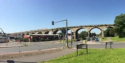 Kirkstall Road Viaduct is a Grade II listed railway viaduct carrying the Harrogate line over the A65 Kirkstall Road, the River Aire, and the Leeds and Liverpool Canal in Burley, Leeds, West Yorkshire. It was built in 1849 by the engineer Thomas Grainger for the Leeds and Thirsk Railway.[1] The viaduct, which is approximately 440 m (0.27 mi), is a significant local landmark due to the wide, shallow nature of the valley it crosses.[2]