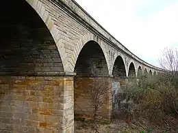 Grainger supervised the construction of the whole the line from Leeds to Stockton-on-Tees via Harrogate and Thirsk; his design features twenty-one segmental arches on large rusticated piers, with chamfered voussoirs and a moulded cornice and parapet. At its south end, over the canal, is a low elliptical arch.[1] The viaduct used local Bramley Fall sandstone[3] in the form of rock-faced ashlar, the light colour of which is distinctive compared to the many red brick and dark buildings which surrounded it on construction. The viaduct was completed on 23 March 1849 and began operation from 9 July.[3]