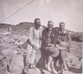 In later years, Lake became increasingly involved in archaeological expeditions. He had remarkable abilities as an organiser and an uncanny skill in finding the necessary money to fund his various undertakings. In the spring of 1927, with Robert P. Blake, he travelled to Saint Catherine's Monastery in Egypt to study biblical manuscripts. While passing through Cairo they met the Egyptologist Alan H. Gardiner who suggested that on their return they might stop by Serabit el-Khadim, which was in the neighbourhood of the monastery, and attempt to locate a number of previously noticed inscriptions in a Proto-Sinaitic script. As Lake remarked in his account of the adventure: "'in the neighborhood' is a relative matter, for, stated in terms of time instead of space, the monastery was about as far from Serabit as New York is from San Francisco." After a week's journey on camels they were able to locate the site and the inscriptions, as well as identify two additional inscriptions not previously known. "It is a pity that we could not identify the fragments more accurately," Lake noted, "but the temperature in the shade was over 115° Fahr., and the fragments were in the sun and almost too hot to touch" (HTR 21 [1928]: 3–4, 5). Lake would return to further investigate the site, as well as the adjacent temple of Hathor in 1930 on an expedition led by him and Blake, this time accompanied by Silva (his future second wife), at the time a Guggenheim fellow, who would handle the photography. In the results of the expedition that were published in 1932, Lake described the camp: "It was not exactly luxurious, and on two days when in rained it was extremely uncomfortable, as we had to spend the whole time in the cave, in which it was impossible to stand upright except in a few spots. The cooking was shared by Professor Blake and Mrs. [Silva] New, and consisted chiefly of rice, with canned meat dissolved in tomato-sauce and curry-powder" (HTR 25 [1932]: 98–99). A final trip was made in 1935; unfortunately, this time Lake was injured during the trip. He received internal injuries when bumped by a camel, but continued the journey, and was carried by litter to the top of the mountain. After supervising the start of the excavation, his condition worsened and he was rushed to Jerusalem with his wife to receive medical attention.[22] In 1929, Lake approached John Winter Crowfoot of the British School of Archaeology in Jerusalem (BSAJ) about a joint excavation with some other institutions of Samaria, to complete the earlier work of Harvard's George A. Reisner. The new dig began in 1931 and Lake was there for four seasons (1931–34), accompanied again by Silva and Blake. The joint team also included Eleazar Sukenik from Hebrew University and Kathleen Kenyon from the BSAJ. The excavation would yield many important results. As for accommodations in the camp, Kenyon reports that "although they had a hotel-trained Egyptian cook and Palestinian servants to do the washing, the expedition staff lived in tents, sleeping on camp beds" and "the social life of the dig consisted of having cocktails at the end of the day, playing bridge after dinner, and in 1933, listening to jazz records."[23] In 1938–39, Lake along with Silva and Robert P. Casey from Brown University were allowed to conduct a small excavation of Van Fortress in Turkish Armenia. For 15 years he had been seeking permission from the Turkish government to make the expedition. He told the press that until 1937, "the savage tribes of Turkish Armenia, the Kurds, have not been sufficiently pacified for the government to recommend the trip."[20] Details of the expedition were published in 1939.