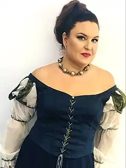 In 2015, she returned to the Liederhalle Stuttgart for Manuel de Falla's El Amor Brujo with the Stuttgarter Kammerorchester and conducted by Matthias Foremny.[37] In the same year, the singer was featured in a tour with Les Siècles Orchester under the musical direction of François-Xavier Roth, its founder, with the opera Der Fliegende Holländer by Wagner, premiering at the Théâtre de Caen,[38] in France, and at the Grand Théâtre de Luxembourg.[39] At St. Gallen Opera, she was Juliette in Berlioz's Roméo et Juliette,[40] Filipjewna in Eugen Onegin under the musical direction of Otto Tausk and stage direction by Lydia Steier,[41] and Maffio Orsini in Lucrezia Borgia by Donizetti under the baton of Pietro Rizzo and scenic direction by Tobias Kratzer.[42]
