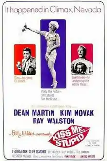 Kiss Me, Stupid is a 1964 American sex comedy film produced and directed by Billy Wilder and starring Dean Martin, Kim Novak, and Ray Walston.