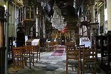 The church of Agia Marina, which dates back to the 17th century, is located in Kissos. The church was built in 1650 during the Turkish occupation of Greece.[2] The size of the church and the fact that it was built in the main square of the village suggest that the church was built with the permission of the Turks. The church is beautifully decorated inside with frescoes and wooden carved iconostases.