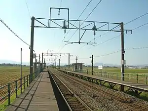 The station is located in a rural area surrounded by rice paddies. There are very few buildings in the vicinity of the station.