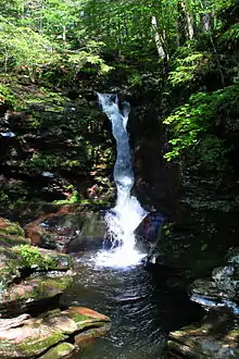 The channel of Kitchen Creek is sinuous. The creek flows through rock formations made of sandstone and shale.[4] There is a gorge and waterfall system on the creek. This system is known as the Kitchen Creek Ravines. The Kitchen Creek Falls, a system of waterfalls and rapids, flows through Ricketts Glen State Park. This system has more than 25 waterfalls and descends 1,000 feet (300 m) in 3 miles (4.8 km).[5]