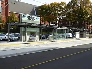 Kitchener City Hall is a stop on the Region of Waterloo's Ion rapid transit system.[1] It is located alongside Duke Street, just east of Young Street, in downtown Kitchener. Just west of the station is its namesake, Kitchener City Hall. It opened in 2019.