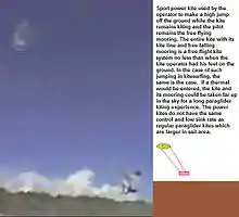 When flying a world-record-sized recreation kite, a famous professional kite flier lost his life as he became an accidental mooring of the large kite. When extreme-sport kitesurfers are themselves the dynamic mooring gone astray, they sometimes slam into rocks, buildings, people, thorns, trees ...that end up in minor to fatal injuries. The kite system called paraglider has the human pilot as the dynamic mooring; when collapse of the kite's wing occurs too near the ground and there is not time to use a parachute, injury results to person and property. When a statically moored kite-type hang glider is moored improperly, gusts sometimes lift the kite and the kite hang glider gets into a lockout condition and slams into the ground, breaking itself and sometimes causing injury to persons and other property. Mooring kites so the kite can reach electric high voltage powerlines can cause outages in electrical service and sometimes injury or death to persons. Most every recreational kite sold has a tag that refers to where to fly the kite; this is implicitly telling the operator to keep the kite moored in a safe manner. Humans are responsible for the kites they anchor or set into free-flight. One of the downsides to the war-time use of barrage balloon (kytoons) involved cut tether [2] cables that dragged into power lines causing loss of production of other needed goods. See the safety list at National Kite Month:[3]
