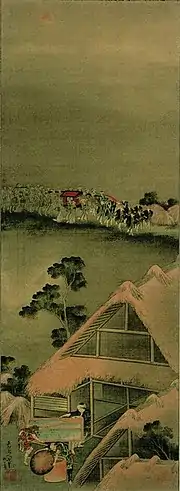 The "Kitsune no Yomeiri-zu" from the Edo period by the ukiyo-e artist Hokusai Katsushika was based upon this folk belief, and it depicted various people surprised by a fox's wedding procession and a sudden shower, and their bustle to take in their crop[29] (refer to image). This has been pointed out to be an unusual example where the imaginary background of the foxes and the real customs of farming villages are depicted at the same time in a painting.[29]