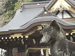 Also in the Hanaoka Tokufuku Inari-sha in Kudamatsu, Yamaguchi Prefecture, in the Inari festival held in November 3 every year, the "kitsune no yomeiri" is performed.[41] This is not related to either atmospheric ghost lights or sunshowers, but is rather a re-enactment of a wedding between foxes, and is due to the efforts of volunteers after the old practice of praying for good harvest at the Inari festival at that shrine ceased in the chaos of the postwar period, and the re-enactment refers to the fact a white fox couple at that shrine was looking for something lost, and was deified as a god of good harvest and thriving business.[41] The ones who perform as the fox couple are selected among the people of Kudamatsu, but it is said that as the female who plays the part of one of the newlywed is going to be blessed with a good match, there is a benefit to a marriage at that same shrine.[41]