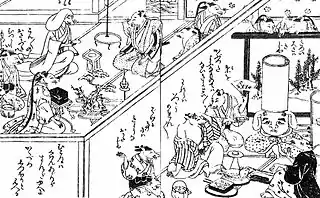 Other than that, in Edo period kusazōshi and kibyōshi such as the Naimono Kuō Kitsune no Mukoiri (無物喰狐婿入) (illustrated by Kitao Masayoshi) published in 1785 (Tenmei 5), "Mukashigatari Kitsune Yomeiri" (昔語狐娶入) (illustrated by Kitao Shigemasa), and "Anasaka Kitsune Engumi" (穴賢狐縁組) (illustrated by Jippensha Ikku), as well as in Kamigata e-hon such as the "Shūgen Kitsune no Mukoiri" and "Ehon Atsumegusa," there are depictions of "foxes weddings" of humanized foxes going through weddings.[37] There was a genre of works called "yomeiri mono" (嫁入り物, "wedding things") of humanized animals going through weddings, but foxes had the special characteristic of concretely having the name Inari no Kami attached to them.[37] This is seen to be an indication that faith in the god Inari as well as "yomeiri mono" both deeply permeated among the common people.[37]