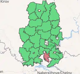 Kiyasovsky District (Russian: Кия́совский райо́н; Udmurt: Кияса ёрос) is an administrative[1] and municipal[7] district (raion), one of the twenty-five in the Udmurt Republic, Russia. It is located in the south of the republic. The area of the district is 821.3 square kilometers (317.1 sq mi).[3] Its administrative center is the rural locality (a selo) of Kiyasovo.[2] Population: 10,305 (2010 Census);[4] 11,550 (2002 Census);[9] 12,603 (1989 Census).[10] The population of Kiyasovo accounts for 31.1% of the district's total population.[4]