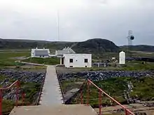 A number of different buildings make up the lighthouse station: lighthouse, machinery hall, boathouse, landings along with multiple residences with outhouses. The residentially functioning buildings are organised around a yard, while the other buildings are situated at a slight distance from this.[3] The white, square, concrete tower is 22 metres (72 ft) tall and it has a cylindrical red lantern on top that emits three white flashes every 40 seconds. The light has an intensity of 290,000 candelas and it can be seen for up to 15 nautical miles (28 km; 17 mi). The light is on from 12 August until 24 April each year. The light is off during the summer due to the midnight sun.[4][5]