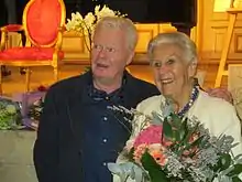 Dellert has also been the initiator and producer of a few gala shows for particular celebrations, such as the show financed by Sweden's Parliament and given in 1976 at the Stockholm Opera for the wedding of King Carl Gustaf and Queen Silvia (where ABBA first performed Dancing Queen and she performed O, min Carl Gustaf).[6] and a review at Södra teatern for her own 50th birthday in 1975.[7] At the latter she summarized with a Swedish version of My Way describing her own life till then with lyrics by Lars Jacob; the words were updated by him so that Dellert could use it for her last recording in 2015 for her 90th birthday, produced by Emil Eikner.[8][9]