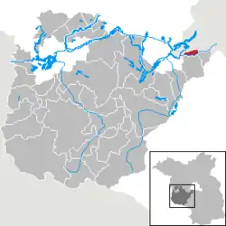 It is situated 19 km (12 mi) South-West of the centre of Berlin, immediately neighbouring the borough of Steglitz-Zehlendorf, and 12 km (7.5 mi) east of Potsdam. The municipality encompasses the settlement of Dreilinden.