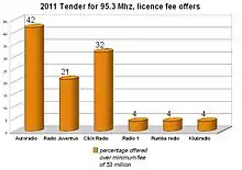 Since the results of the other tenders (invited with identical terms and conditions as 95.3Mhz) were not attacked in court, the winner, Juventus radio was given the green light to start broadcasting on the 1st of February on 103,9 MHz. Juventus has to pay a yearly license fee of 52 million forints for using that frequency.[20] Klubrádió submitted only a bid for a single one of three identical tenders, raising concerns that it was just a try in order to lose the bidding on purpose. Klubrádió's financial offer was also inferior to other tender participants, as well as conditions offered.[15] After the results of Klubrádió's second place were announced, an intense media campaign was immediately launched by Klubrádió.