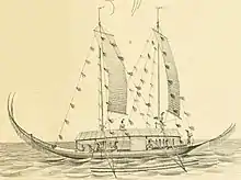 This vessel is shaped like a kora kora, but with different outrigger boom placement. Like kora kora, it also has deckhouse at the center of the hull. It has two main booms which slope down to the float (katir in Malay language) and each has an accessory boom.[1] A boom-spar is located above the vessel, one end of which rests on the roof.[2] The float (katir) is double on each side. It has two masts, each rigged with narrow, very high sails from bamboo and palm leaf.[3][4]