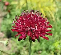 Knautia macedonica, the Macedonian scabious, is a species of flowering plant in the family Caprifoliaceae, native to Southeastern Europe - Albania, Bulgaria, Greece, North Macedonia, southeastern Romania and Kırklareli in Turkey.[1] Growing to 75 cm (30 in), this herbaceous perennial produces rich red "pincushion" flowers, similar to those of its close relative scabious (Scabiosa), on slender upright stems throughout summer.[2]