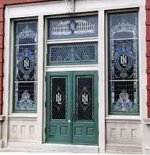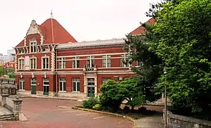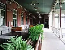 The building's most recognizable feature is its northeast corner tower, which rises three stories, and is topped by a pitched, clay-tiled roof with decorated dormers. A smaller tower rises at the end of the west wing, giving the building its chateau-like appearance. A wrap-around veranda allows access to the main floor on the south side of the building. The north side of the west wing originally included frosted glass doors and glazed transoms, which have been restored. Due to the construction of the Western Avenue Viaduct, the building's ground level lies about 10 feet (3.0 m) below Western Avenue, with a ramp providing vehicular access.[1]