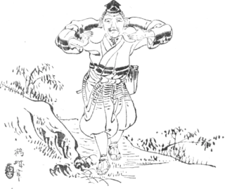 One day he went into the mountain to cut wood, and was caught in the rain. He took refuge in the hollow of a tree.[lower-alpha 7] He was soon to witness a gathering of strange beings nearby, some one-eyed and some mouth-less.[15][20][14][lower-alpha 8] They were the oni[21] (demons or ogres; "devils" being the Christendom equivalent[7]).[lower-alpha 9]